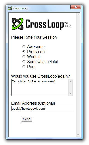 ويمكن النقر على أيقونة المجلد قليلا على نافذة CrossLoop لارسال الملفات من جهاز كمبيوتر واحد على الآخر.